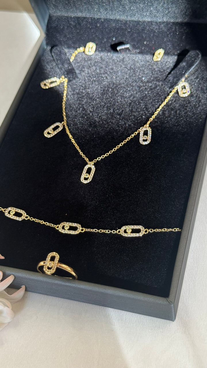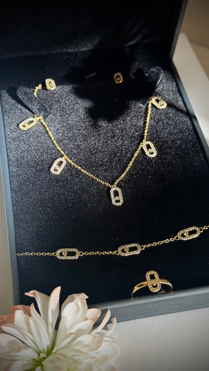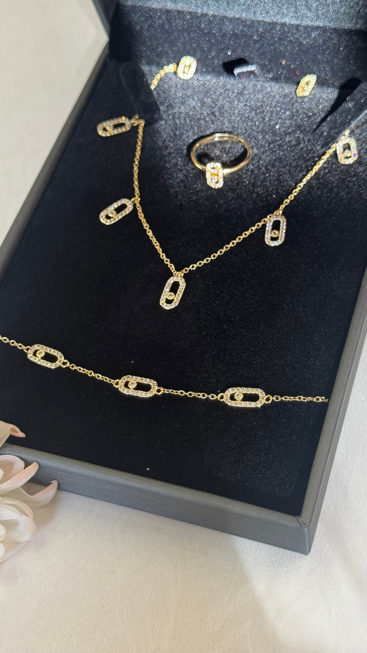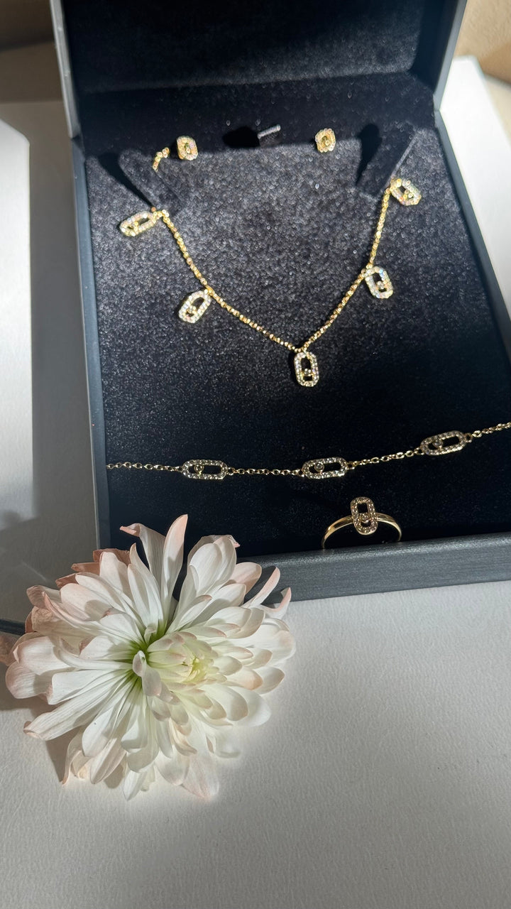 Add a contemporary edge to your jewelry wardrobe with this elegant four-piece set featuring a necklace, bracelet, ring, and earrings. Crafted in radiant gold-plated metal, each piece is adorned with delicate geometric oval motifs encrusted with sparkling zircon stones — a perfect balance between minimalism and sophistication.