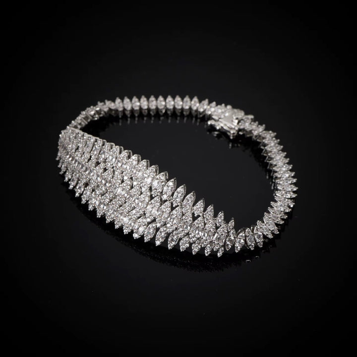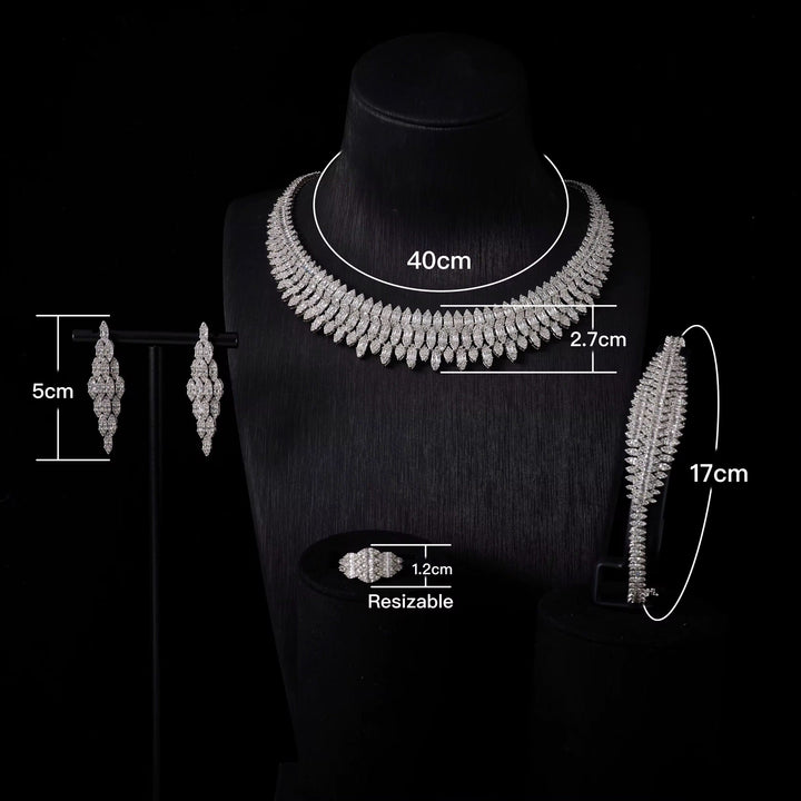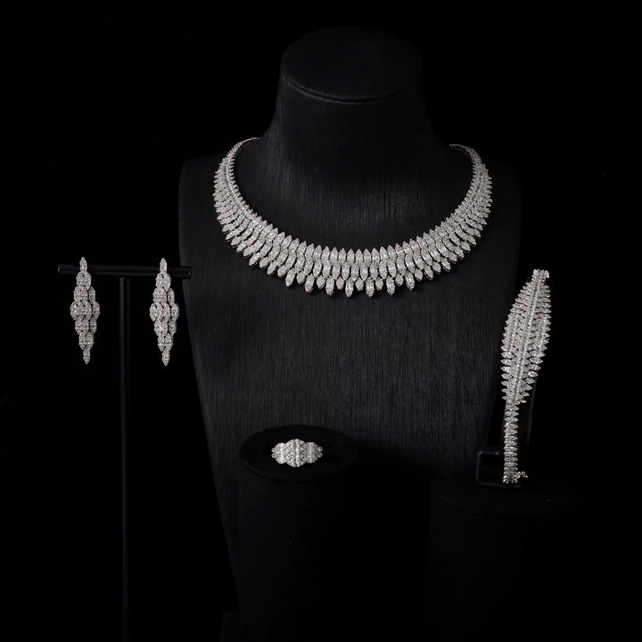 This luxurious 4-piece bridal set includes a radiant necklace, elegant bracelet, delicate earrings, and a shimmering ring, all adorned with high-quality zircon stones that sparkle like real diamonds.