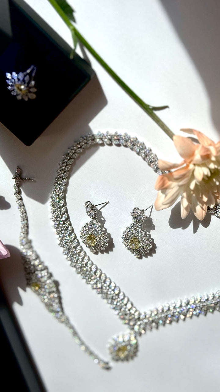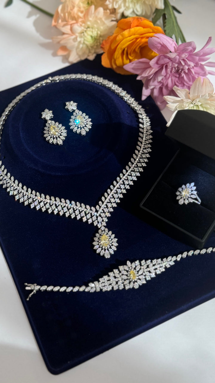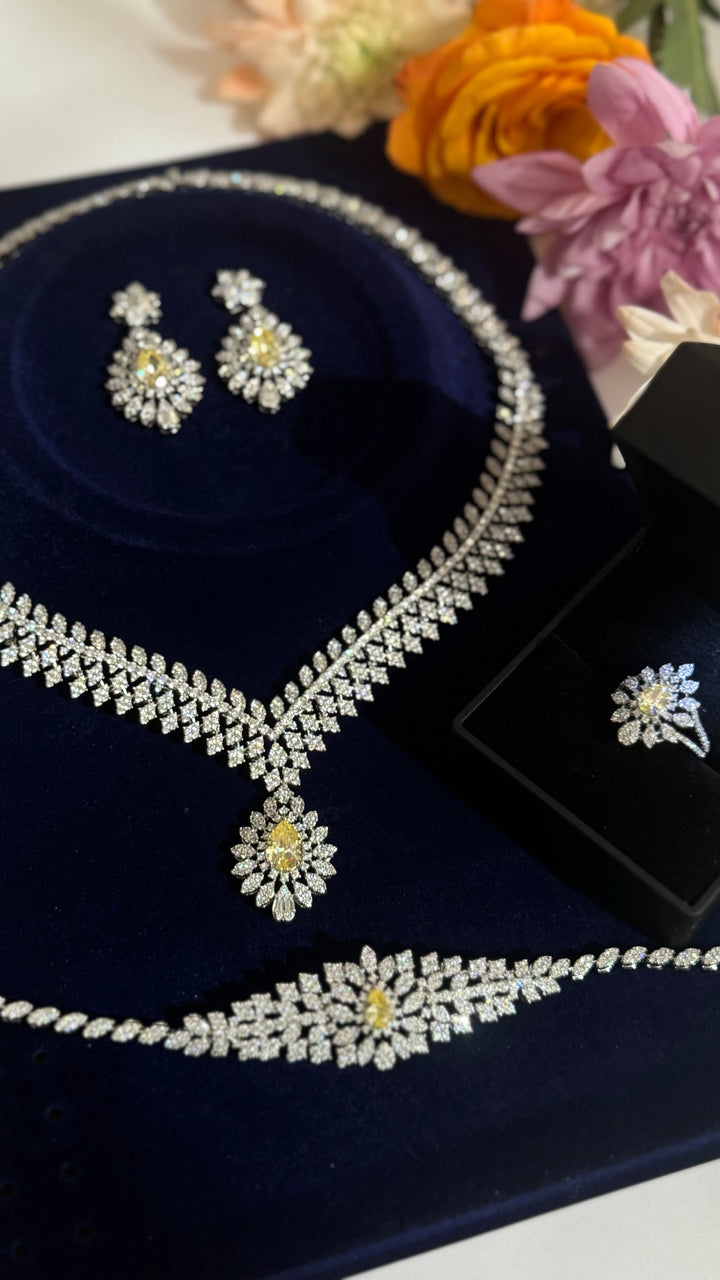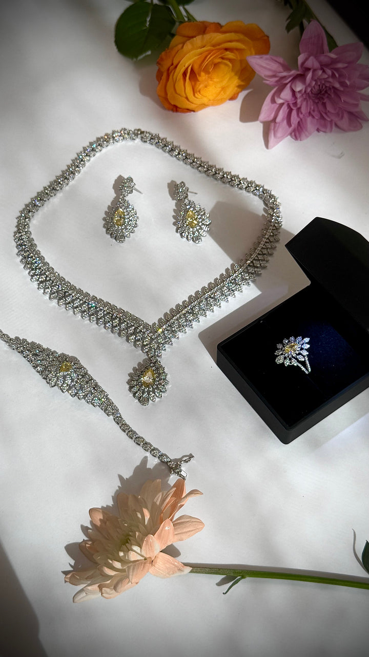 - Finish: Sparkling white and yellow zircon in a floral-inspired design