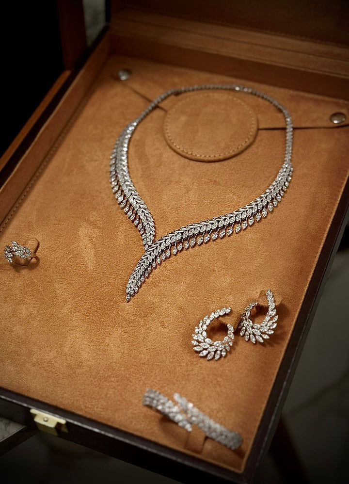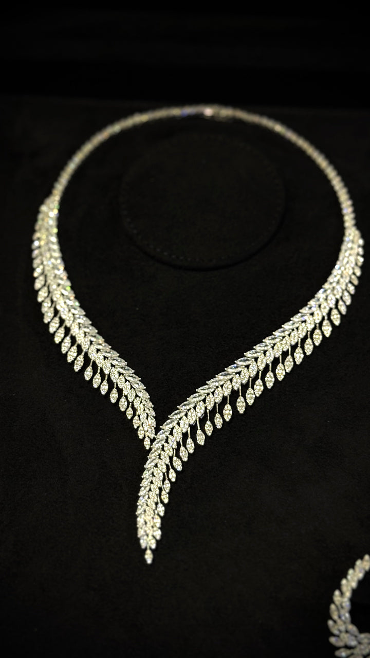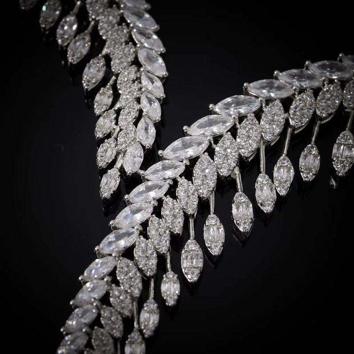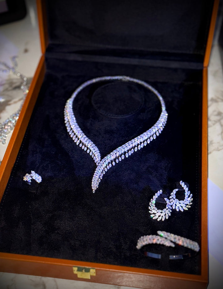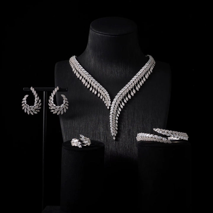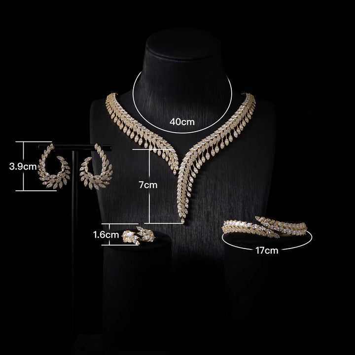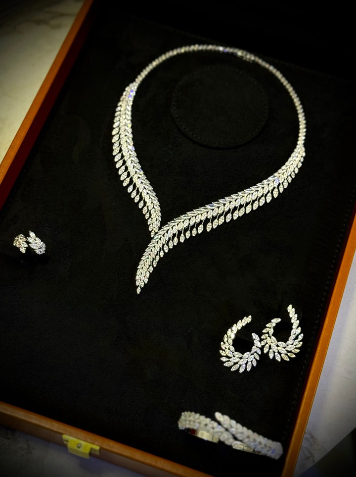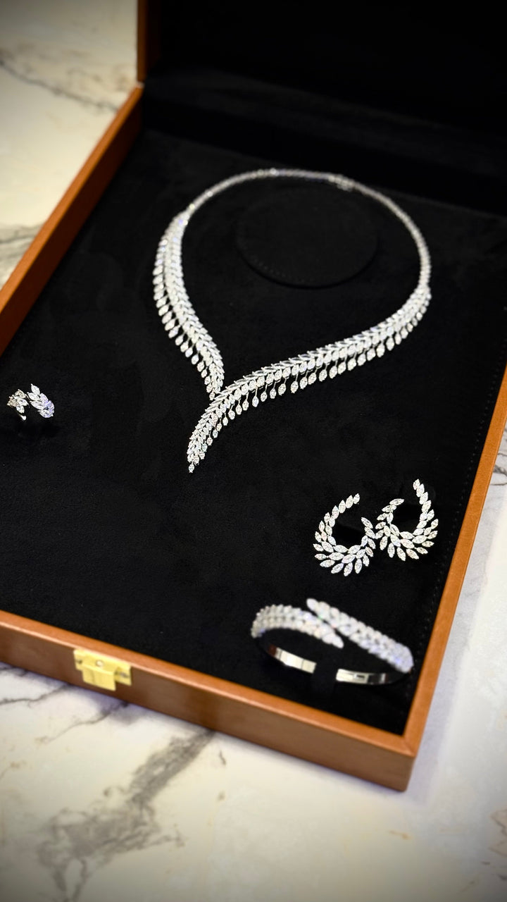 This set includes a graceful necklace, matching earrings, a statement ring, and a sleek bracelet — all featuring a leaf-inspired design that symbolizes grace, growth, and sophistication. Made with premium materials, the Lumière set is not only dazzling but also durable, maintaining its sparkle even through daily wear and exposure to water.