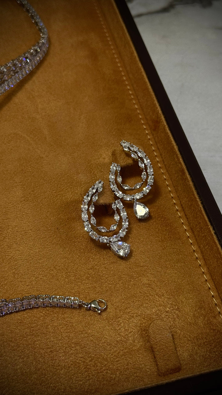 Made from high-quality zircon stones and luxury-finish materials, this set captures the essence of fine jewelry with a waterproof, tarnish-resistant, and skin-friendly design — making it perfect for your big day and beyond.
