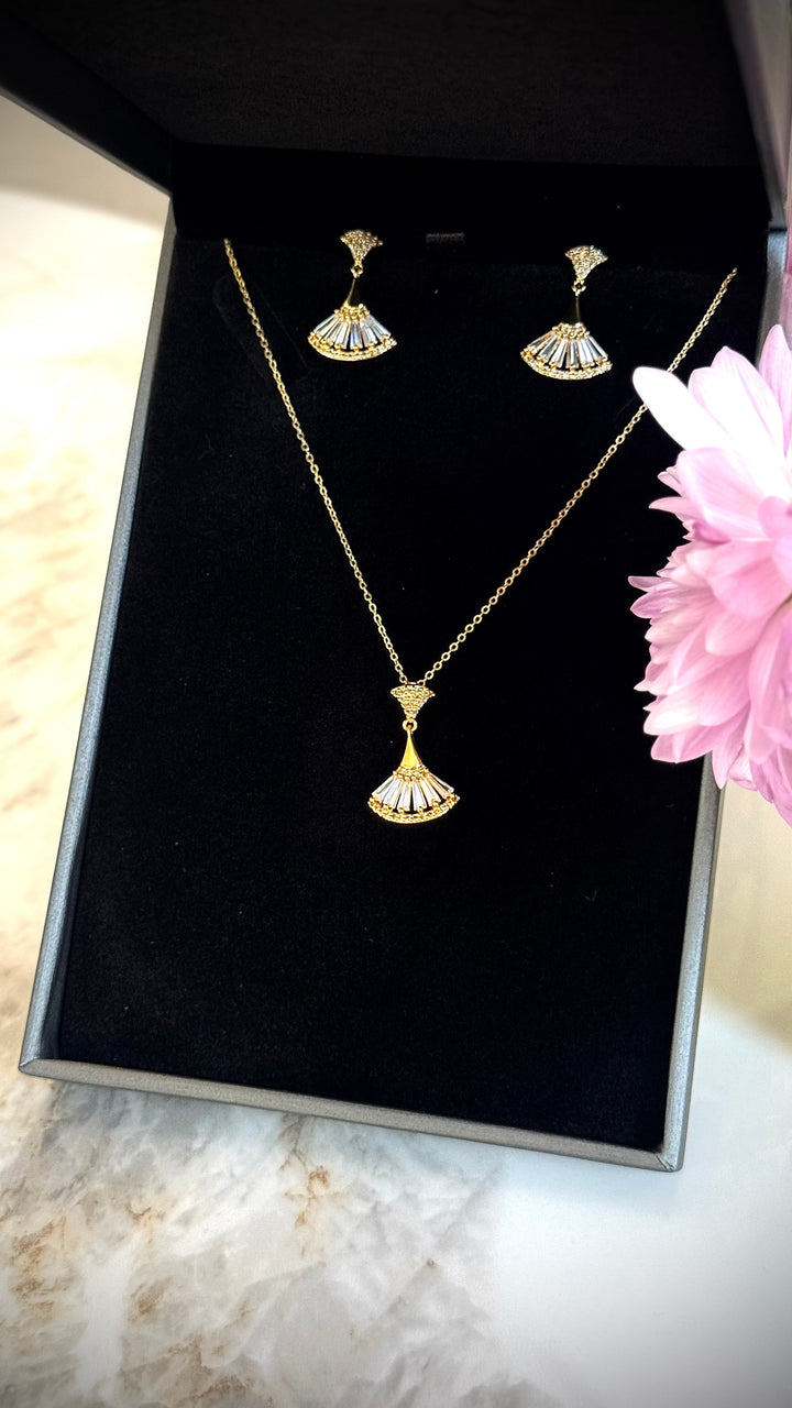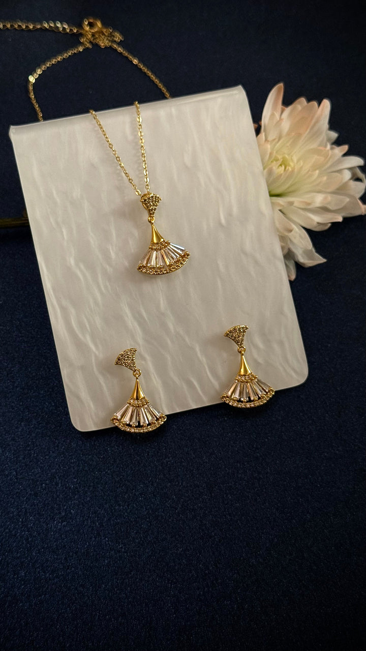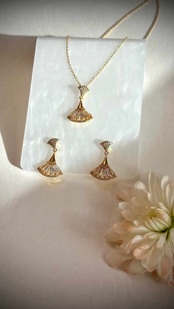 Add a touch of timeless elegance to your collection with this stunning gold-plated necklace and earring set. Expertly crafted with high-quality zircon stones, the set features a unique fan-shaped design that captures the light beautifully, offering a sophisticated sparkle with every movement.