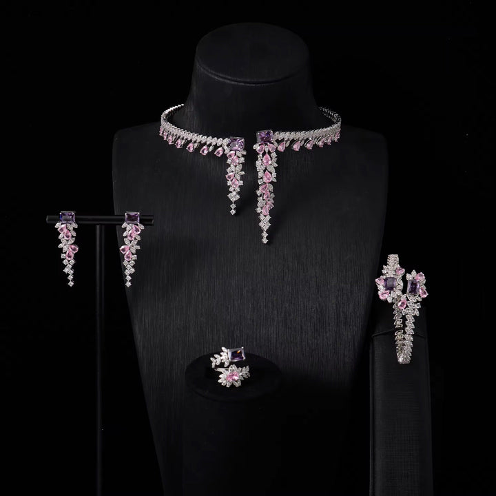 This 4-piece bridal collection includes a refined necklace, elegant bracelet, sparkling earrings, and a graceful ring, all crafted with high-quality zircon stones that radiate like real diamonds.