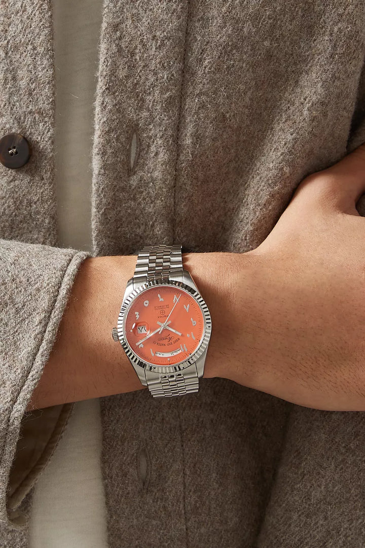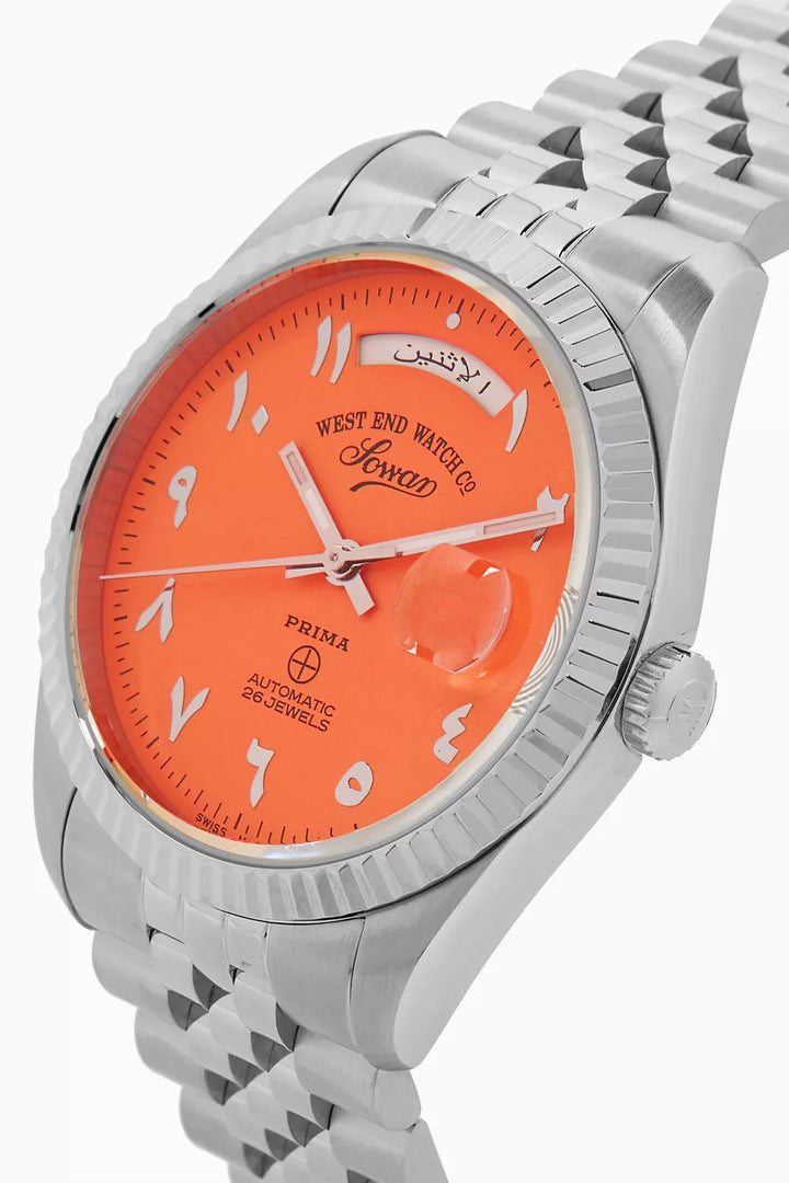 Movement: • Automatic movement • Water resistant 50m Case: • Colour: Silver • Stainless steel • Sapphire crystal • Notched bezel Dial: • Colour: Orange • Arabic number indexes •...